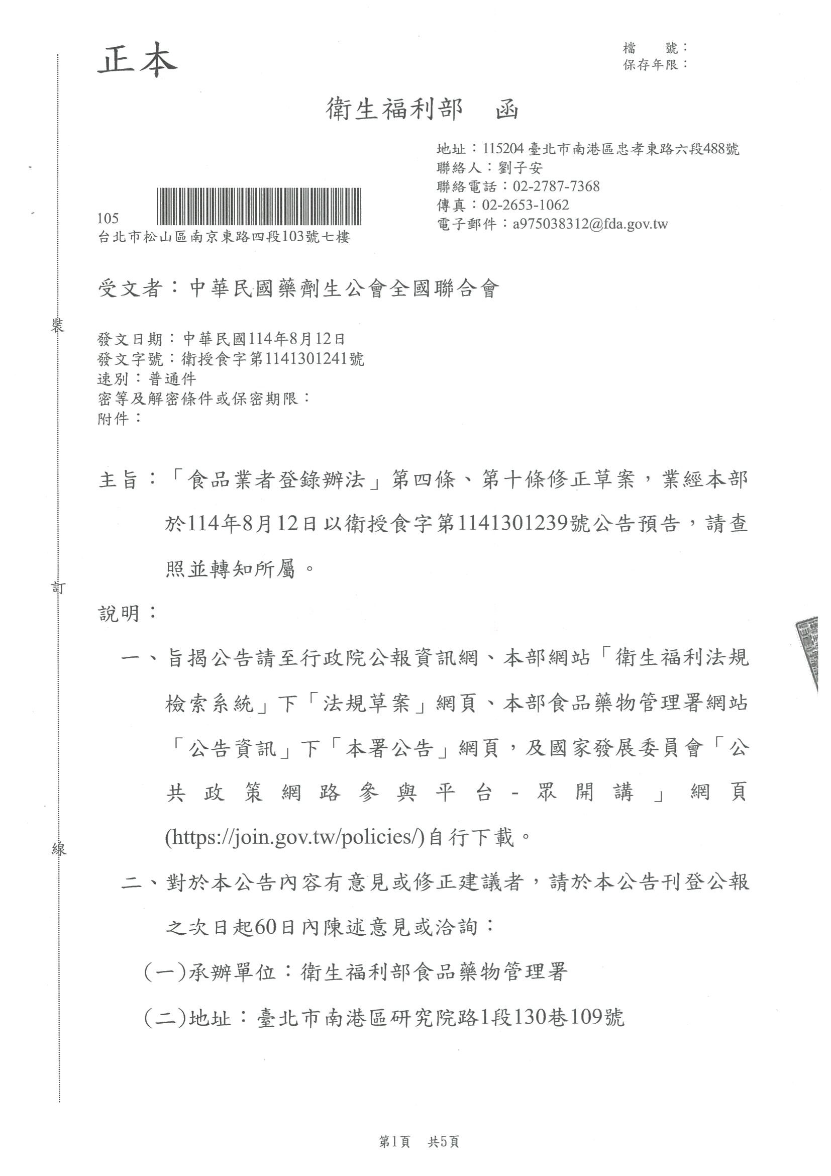 「食品業者登録辦法」第四條、第十條修正草案,業經本部於114年8月12日以衛授食字第1141301239號公告預告,請查照並轉知所屬。
