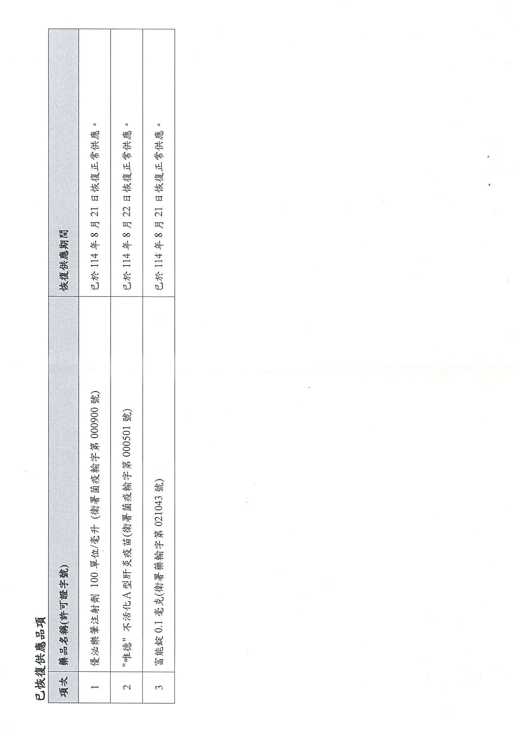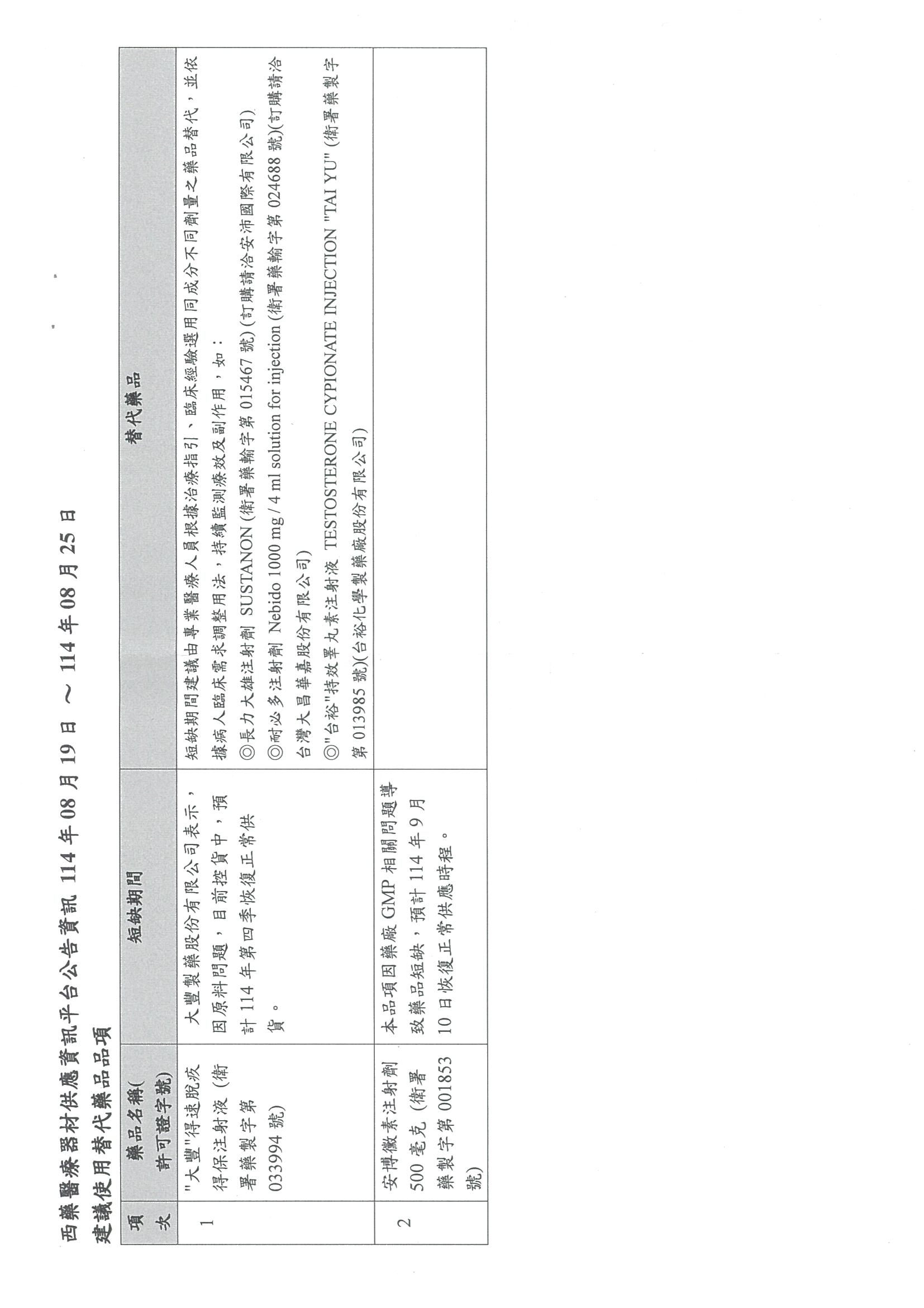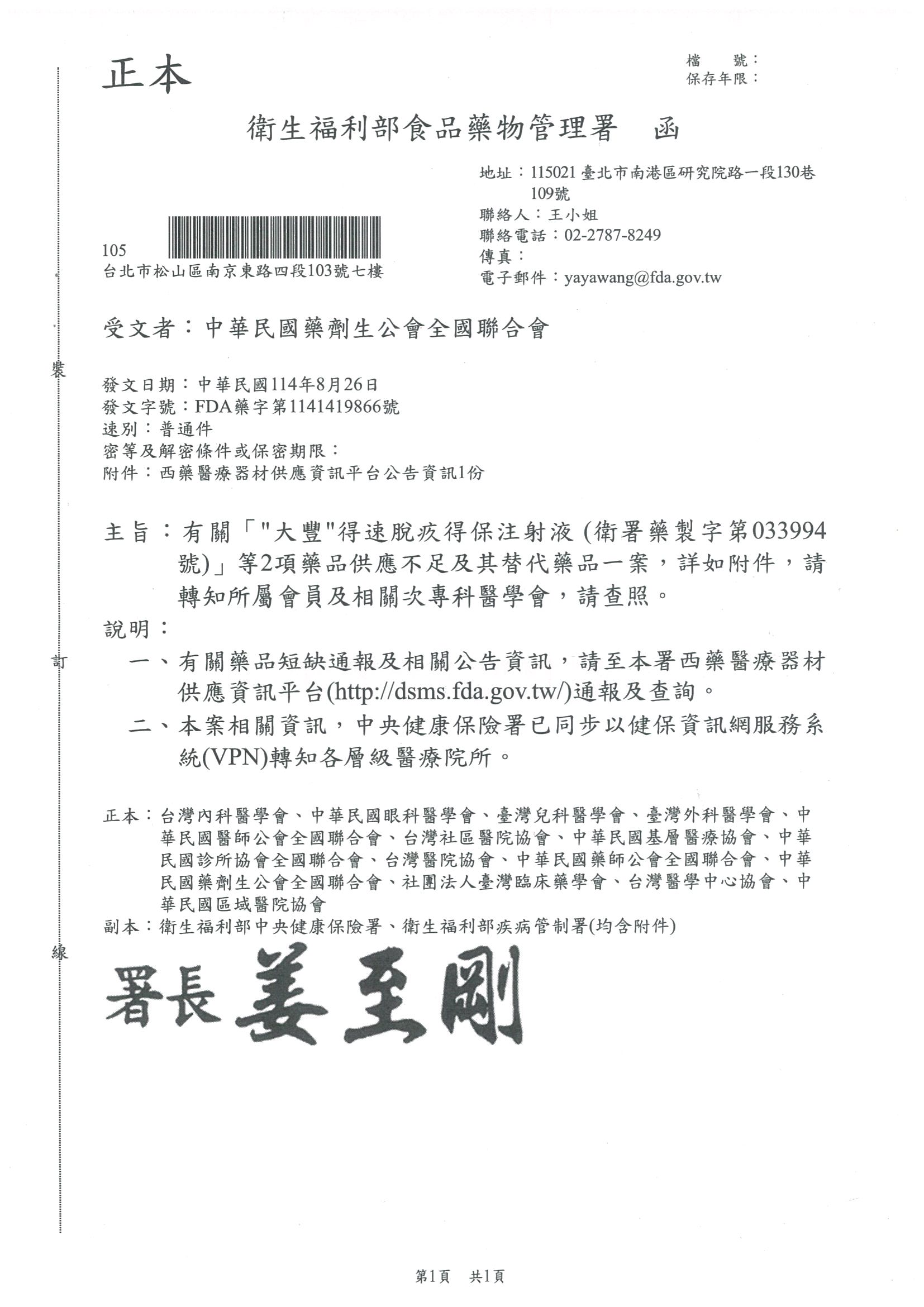 有關「"大豐"得速脫疚得保注射液(衛署藥製字第033994號)」等2項藥品供應不足及其替代藥品一案,詳如附件,請轉知所屬會員及相關次專科醫學會,請查照。