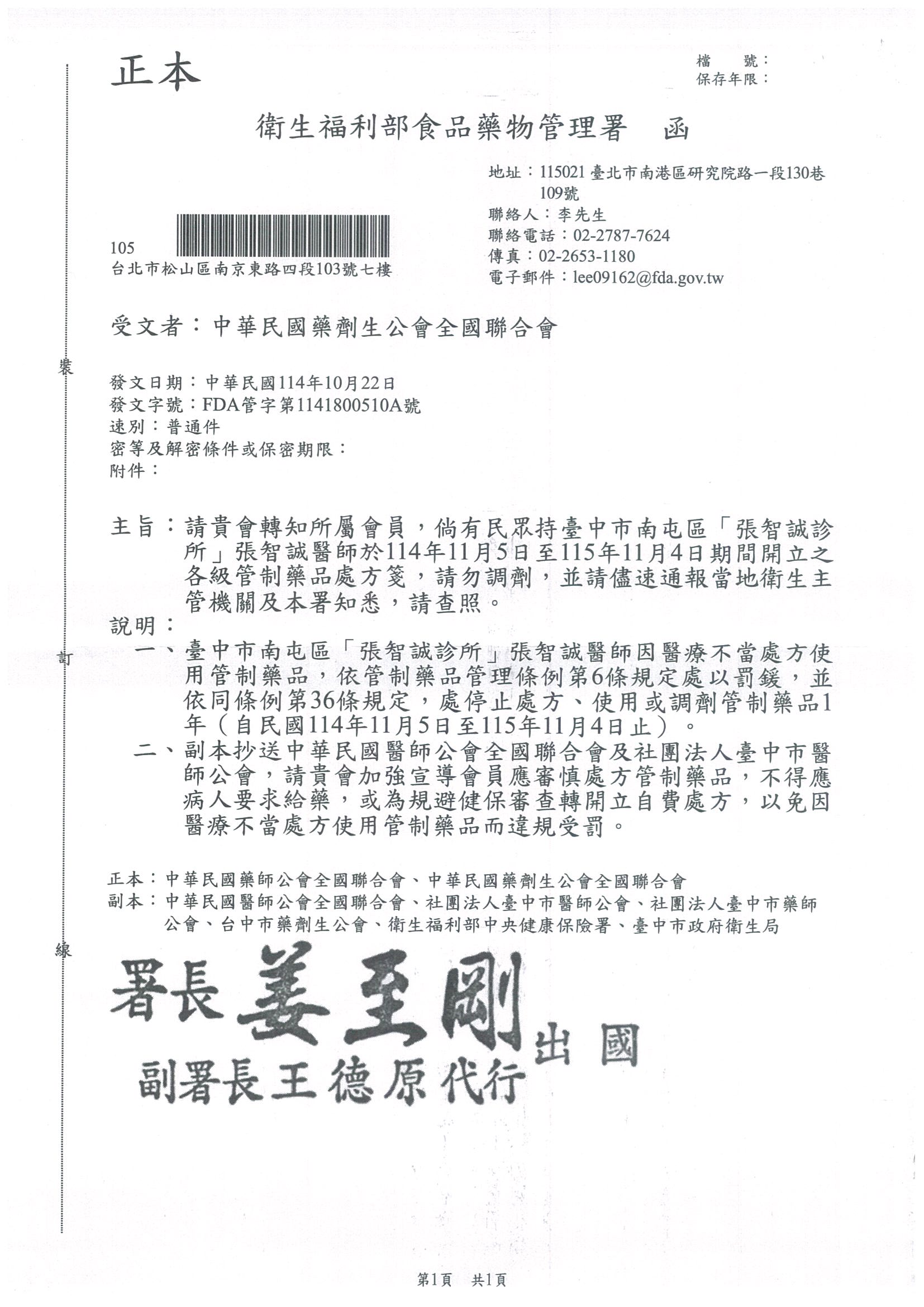 請貴會轉知所屬會員,倘有民眾持臺中市南屯區「張智誠診所」張智誠醫師於114年11月5日至115年11月4日期間開立之各級管制藥品處方箋,請勿調劑,並請儘速通報當地衛生主管機關及本署知悉,請查照。