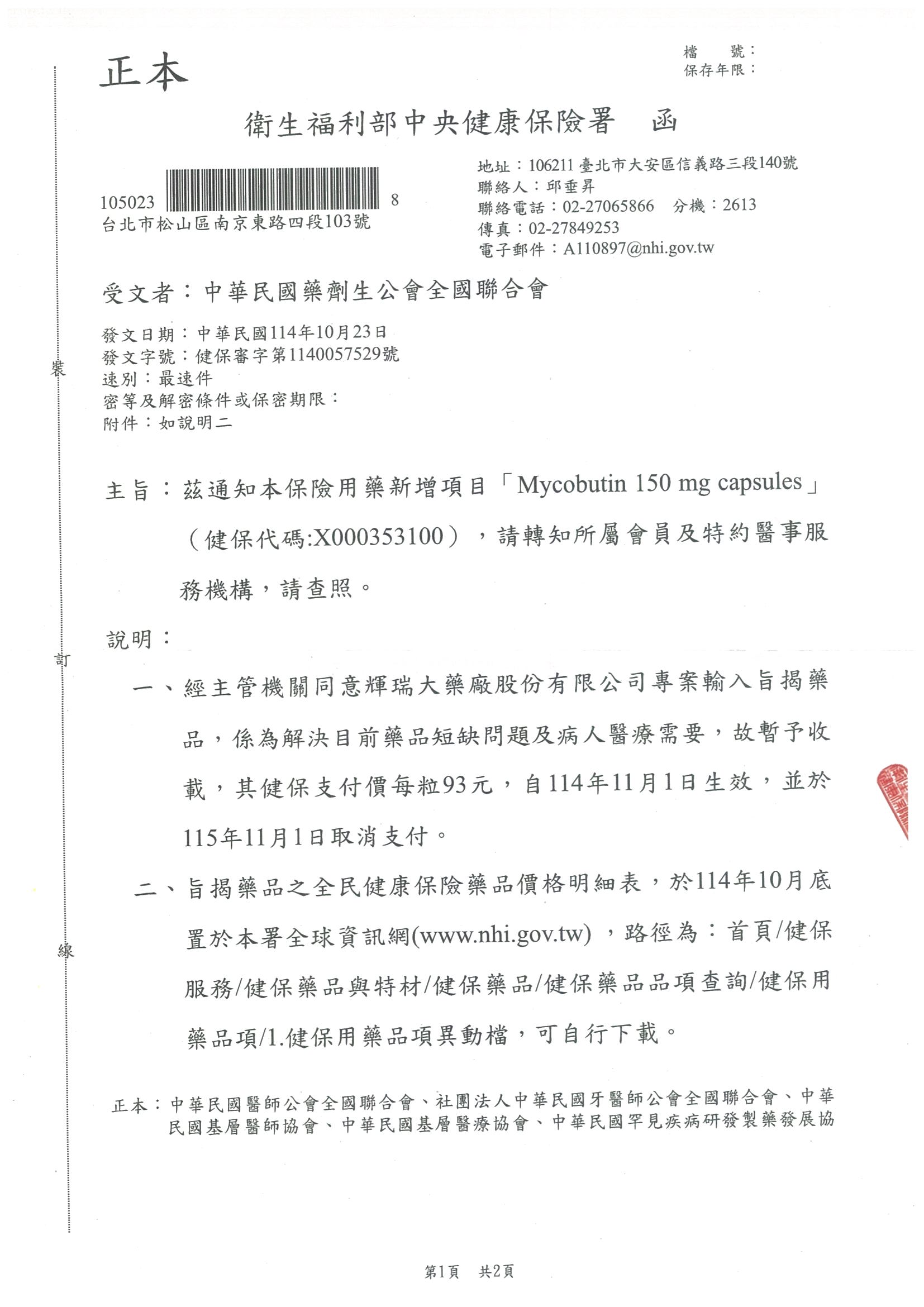 茲通知本保險用藥新增項目Mycobutin 150 mg capsules」健保代碼:X000353100),請轉知所屬會員及特約醫務機構,請查照。