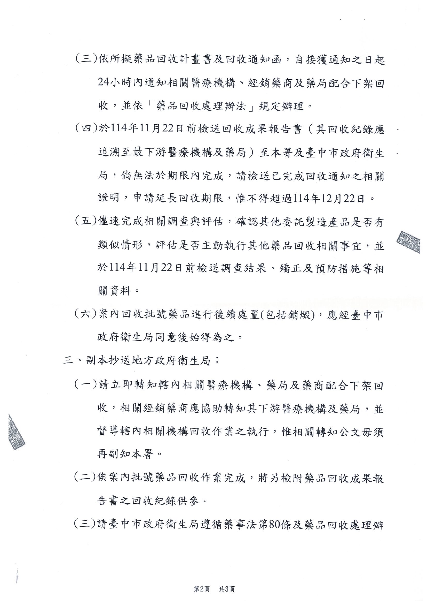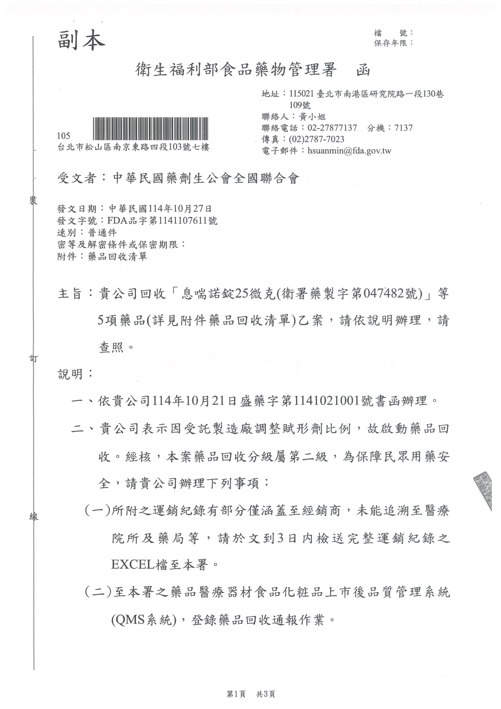 貴公司回收「息喘諾錠25微克(衛署藥製字第047482號)等5項藥品(詳見附件藥品回收清單)乙案,請依說明辦理,請查照。