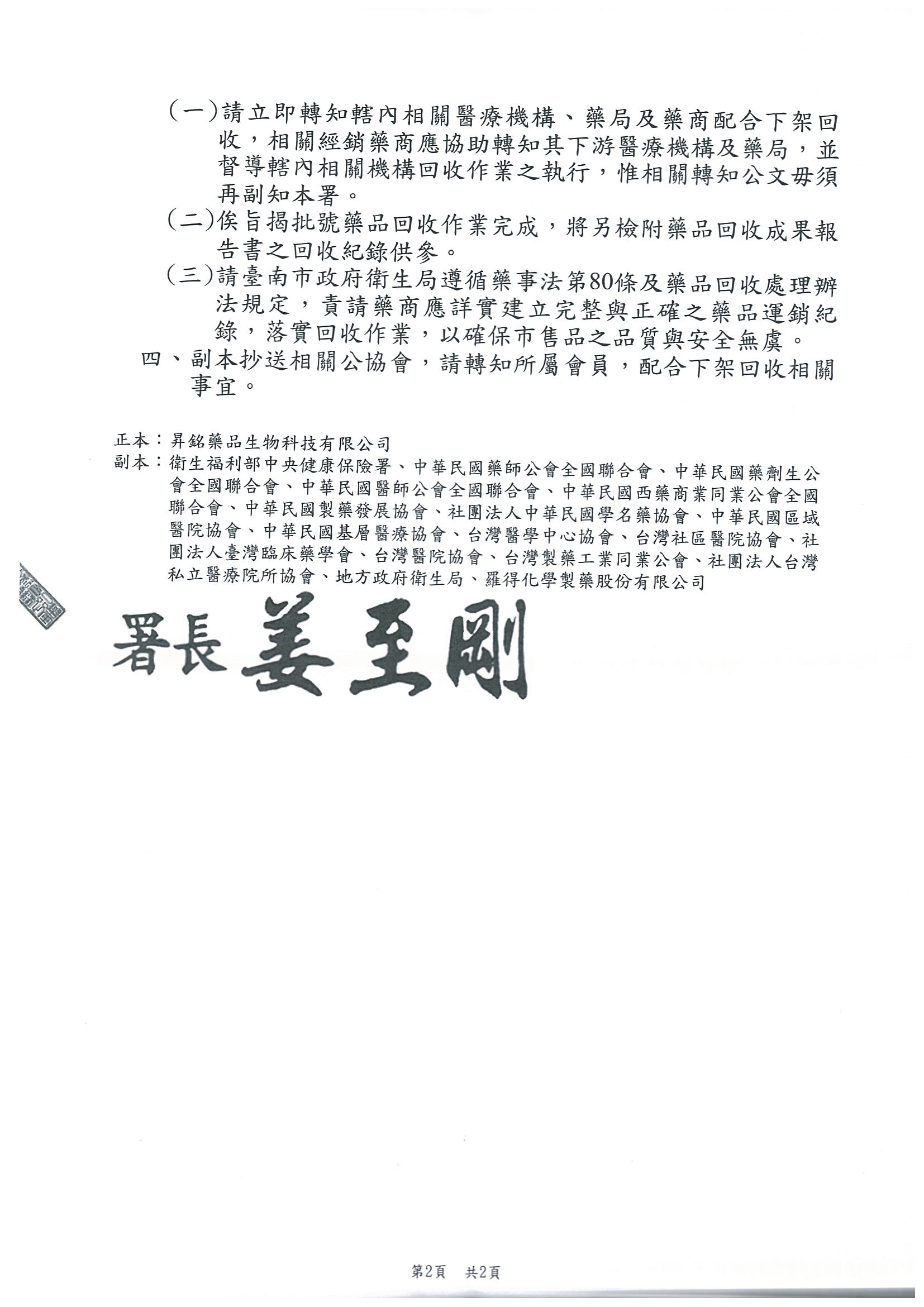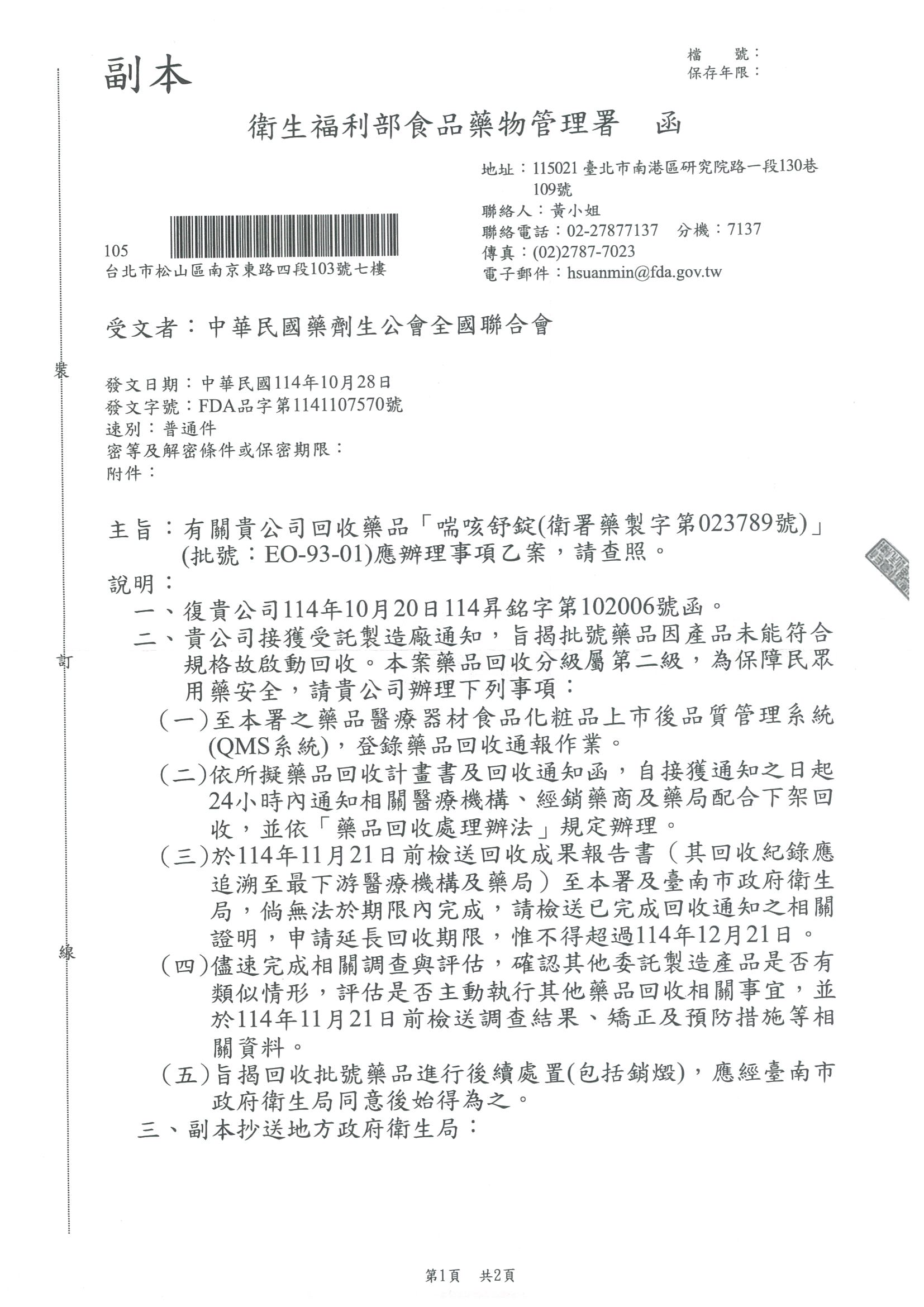 有關貴公司回收藥品「喘咳舒錠(衛署藥製字第023789號)」(批號:EO-93-01)應辦理事項乙案,請查照。