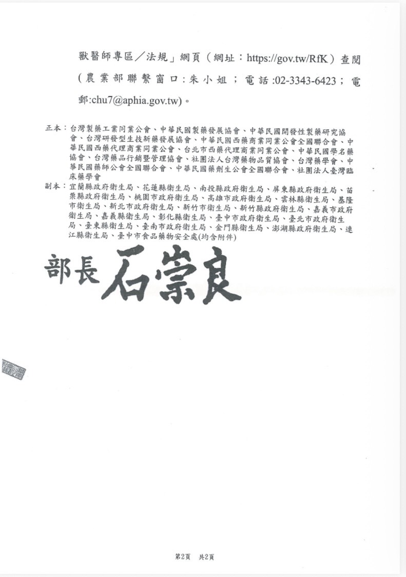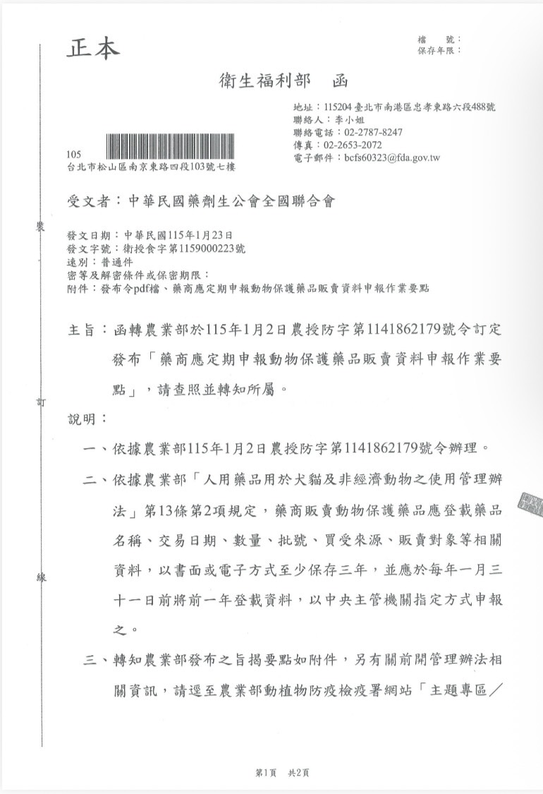 函轉農業部於115年1月2日農授防字第1141862179號令訂定 發布「藥商應定期申報動物保護藥品販賣資料申報作業要 點」,請查照並轉知所屬。