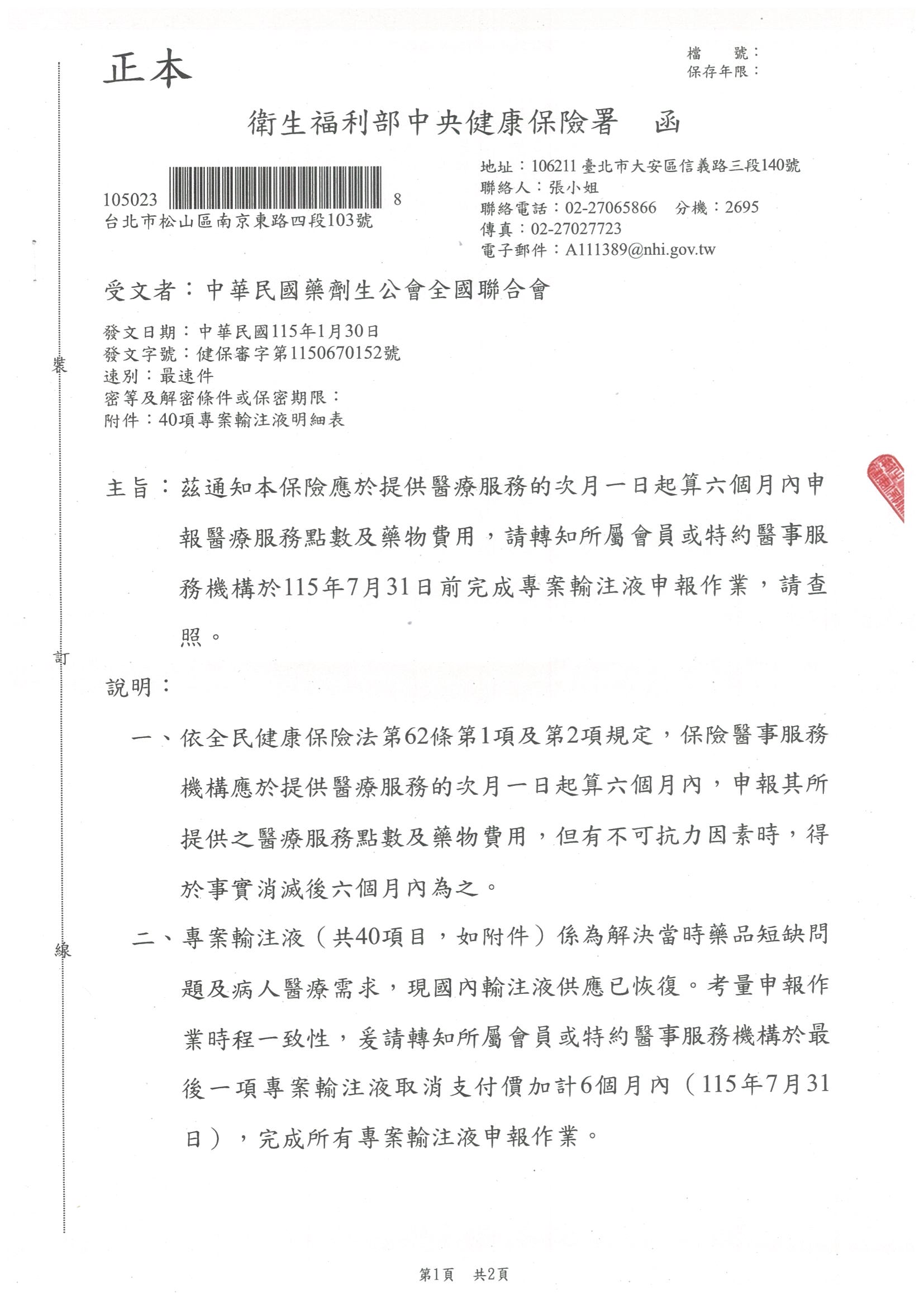 茲通知本保險應於提供醫療服務的次月一日起算六個月內申報醫療服務點數及藥物費用,請轉知所屬會員或特約醫事服