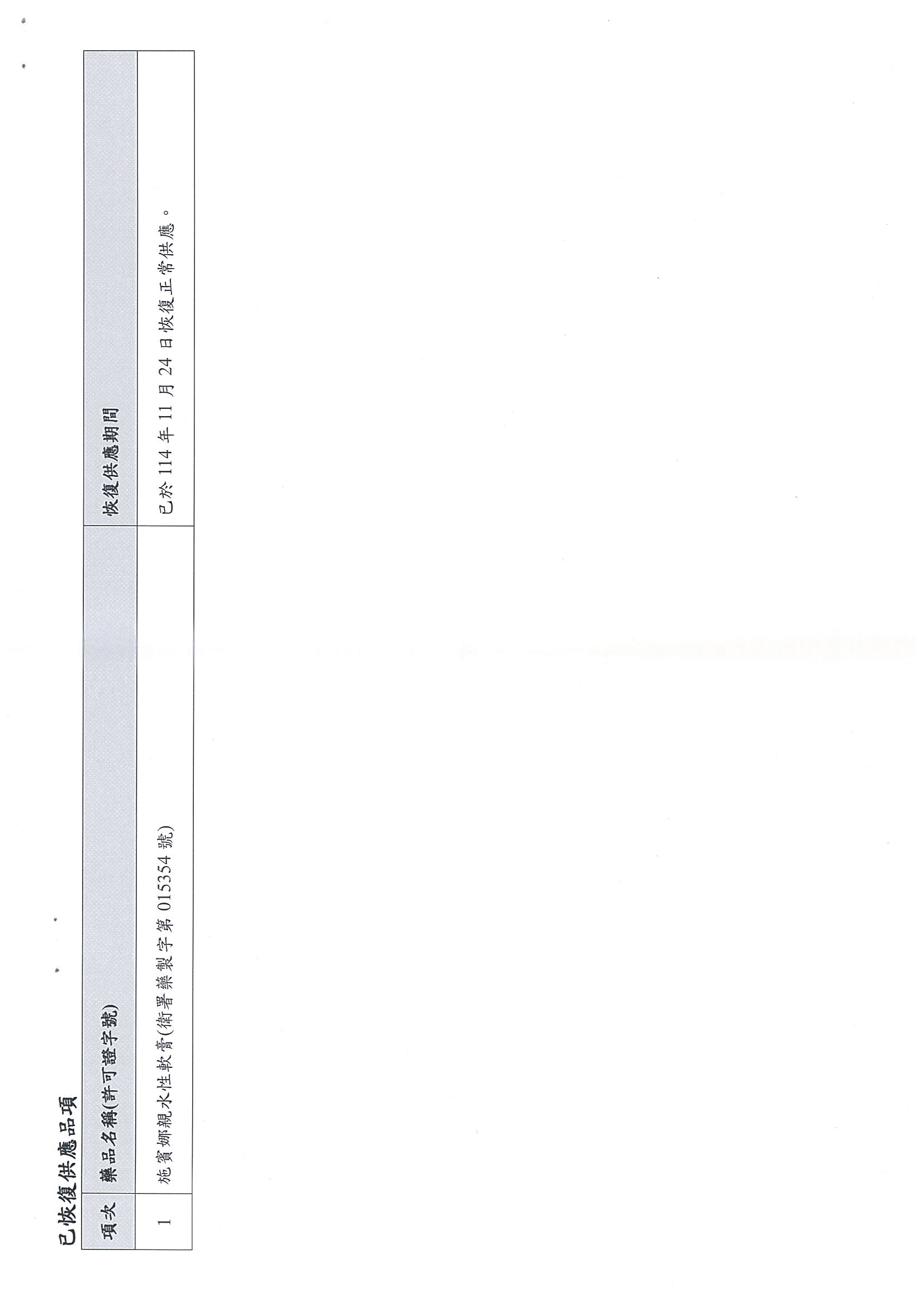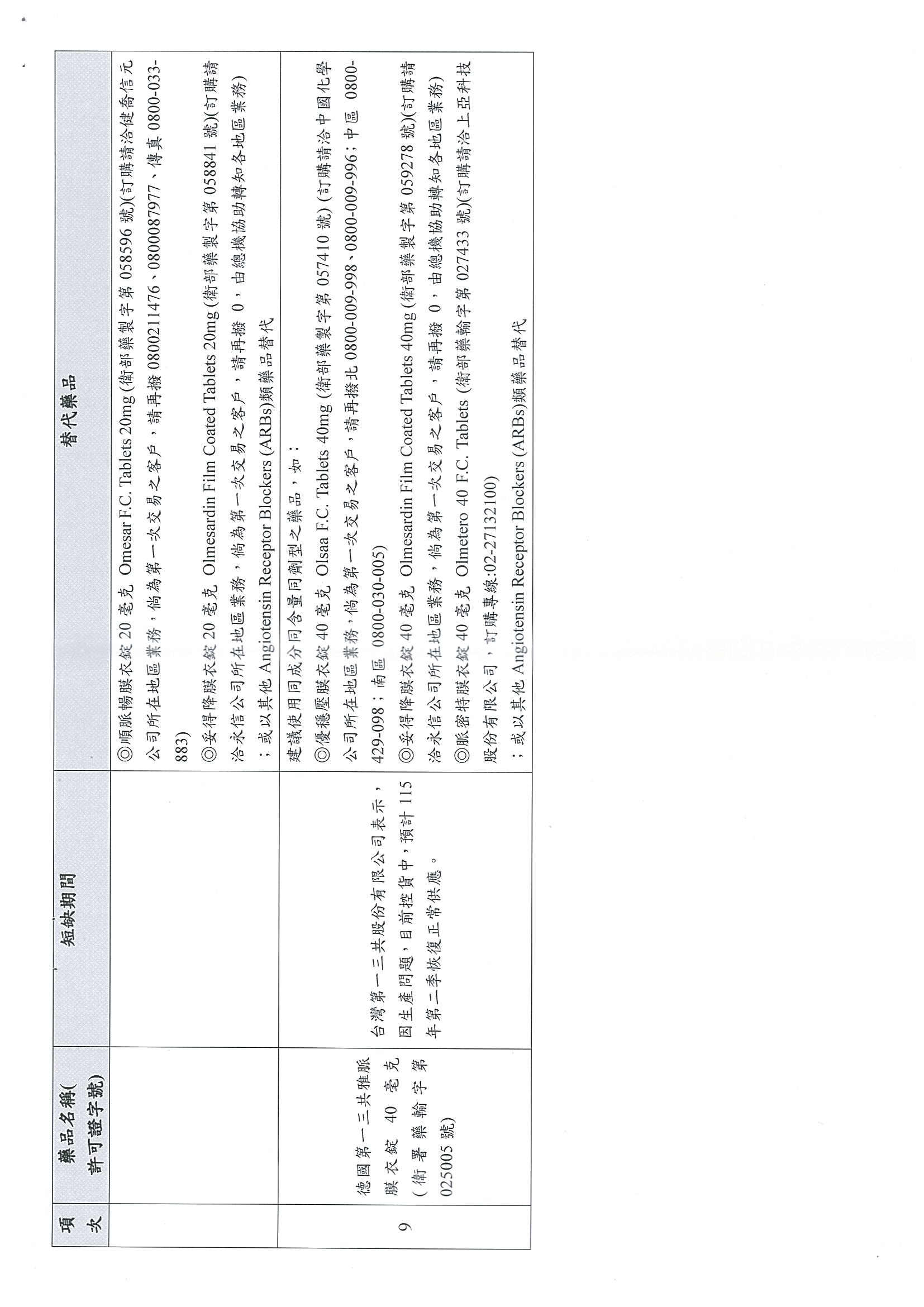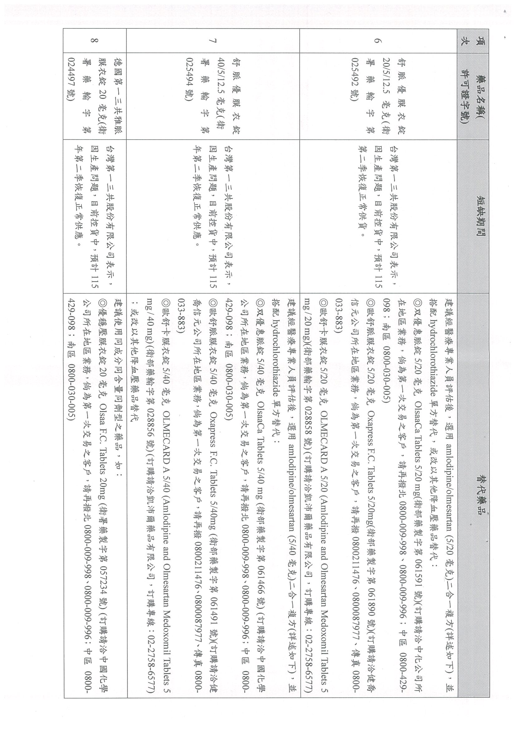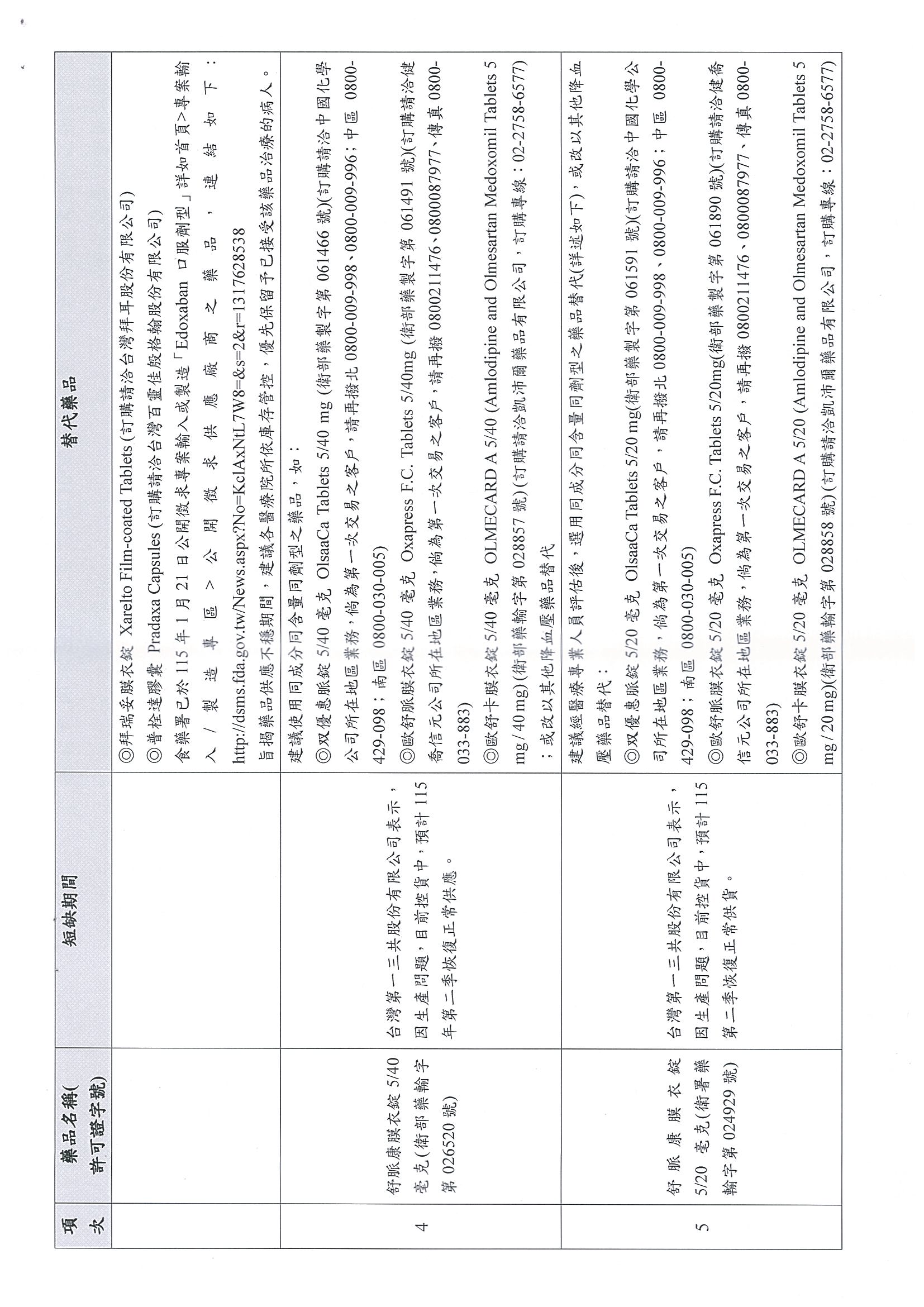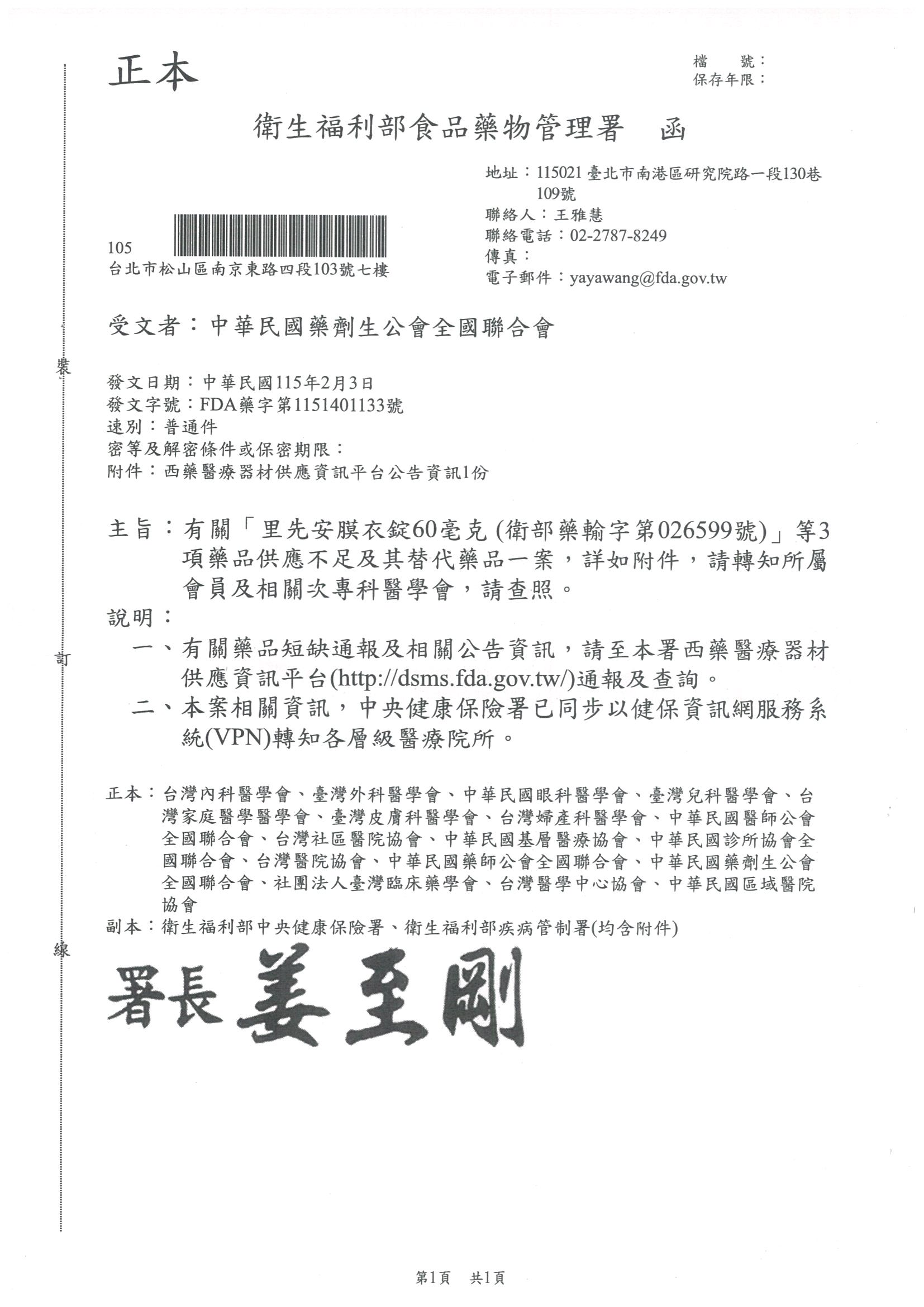 有關「里先安膜衣錠60毫克(衛部藥輸字第026599號」等3項藥品供應不足及其替代藥品一案,詳加附件,請轉知所屬會員及相關次專科醫學會,請查照。
