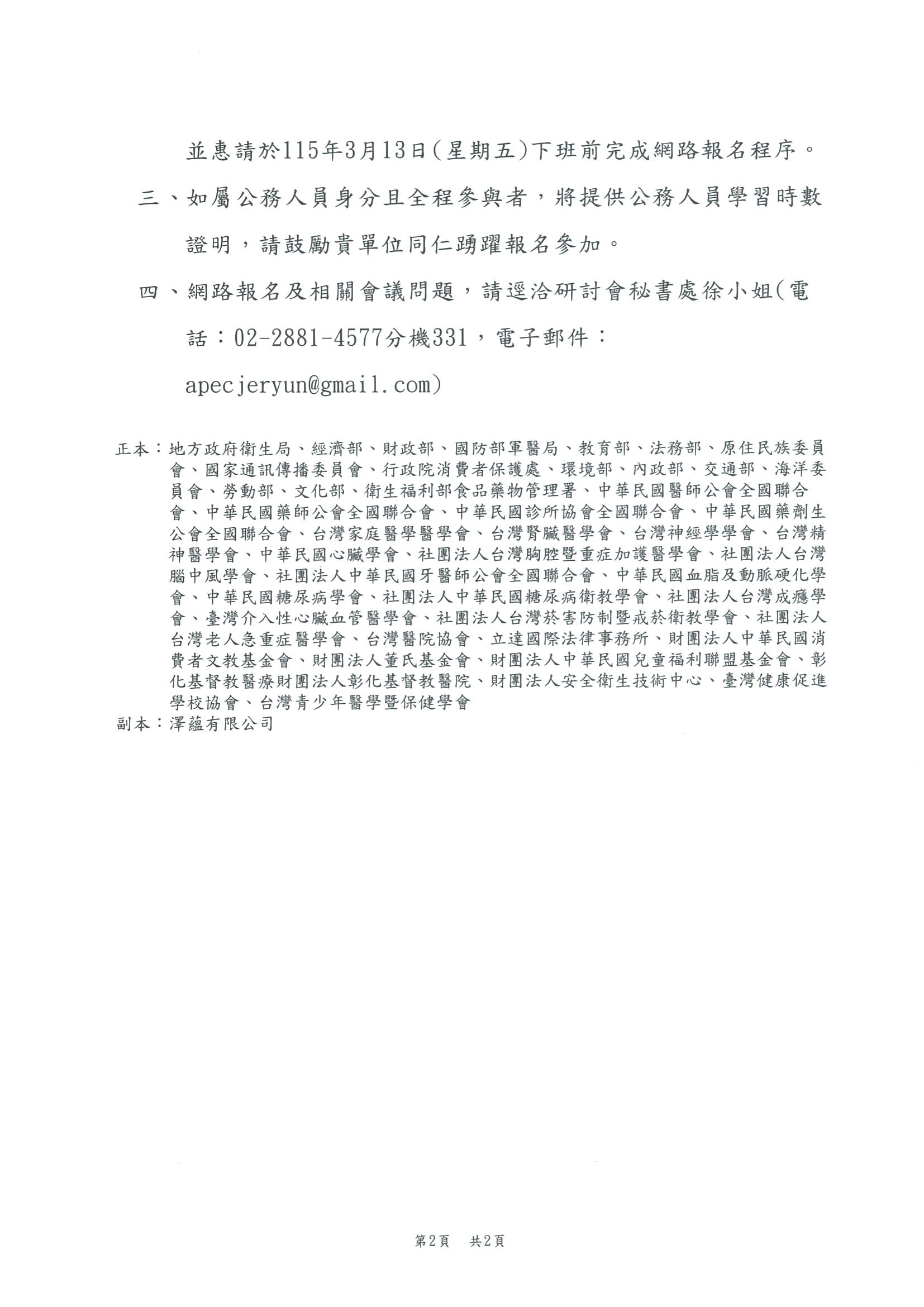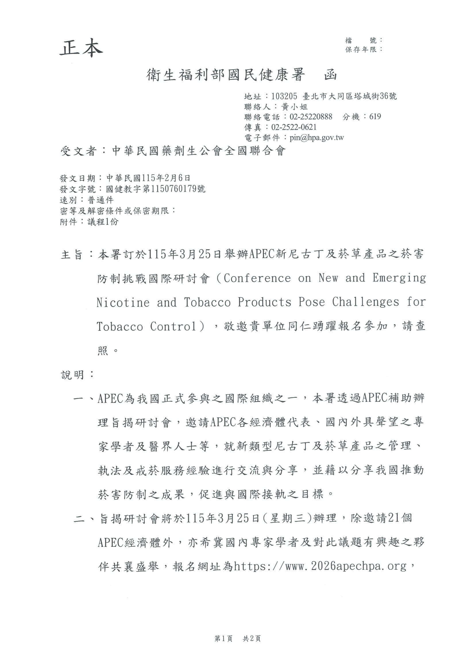 本署訂於115年3月25日舉辦APEC新尼古丁及菸草產品之菸害防制挑戰國際研討會(Conference on New and EmergingNicotine and Tobacco Products Pose Challenges forTobacco Control),敬邀貴單位同仁踴躍報名參加,請查照
