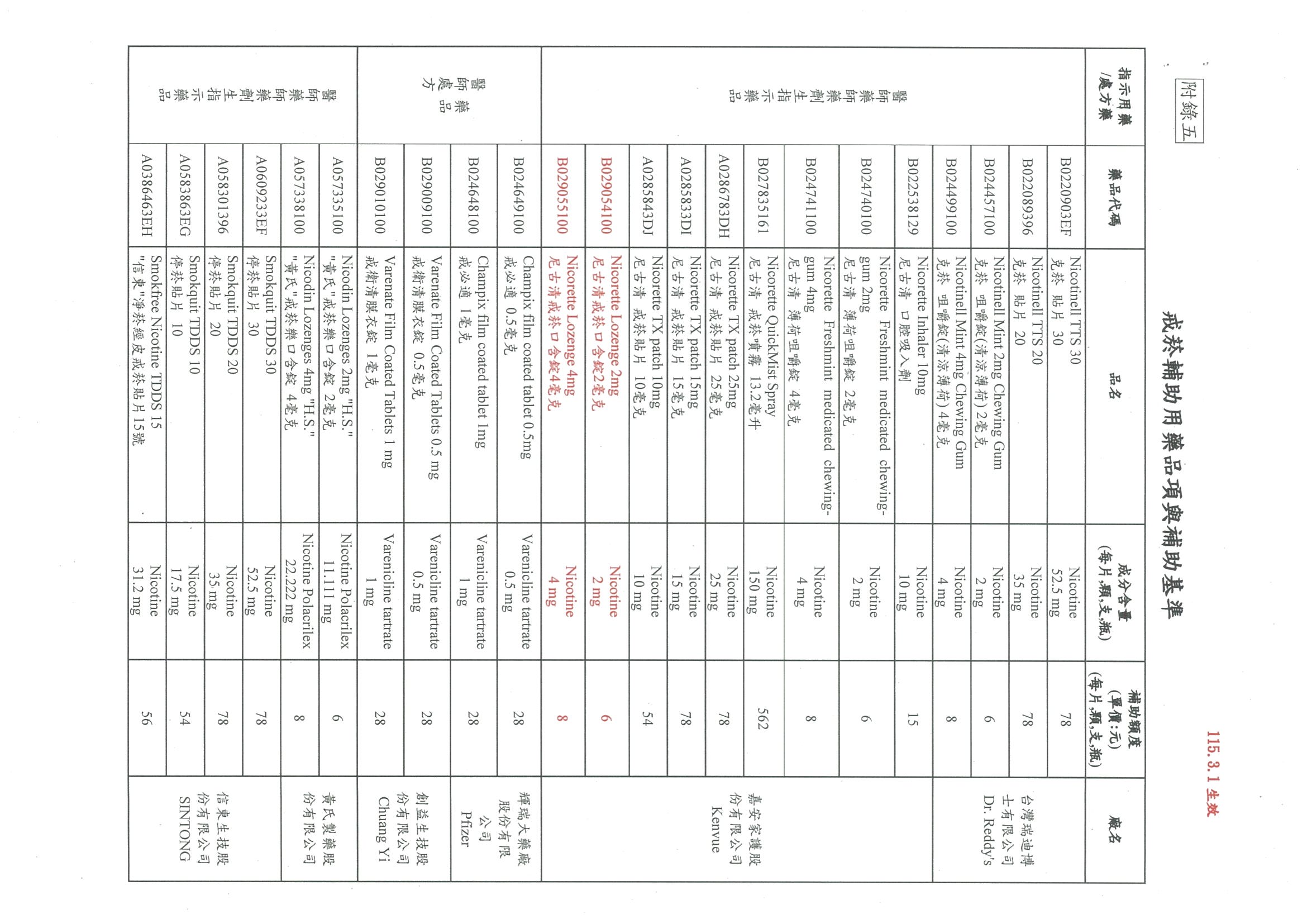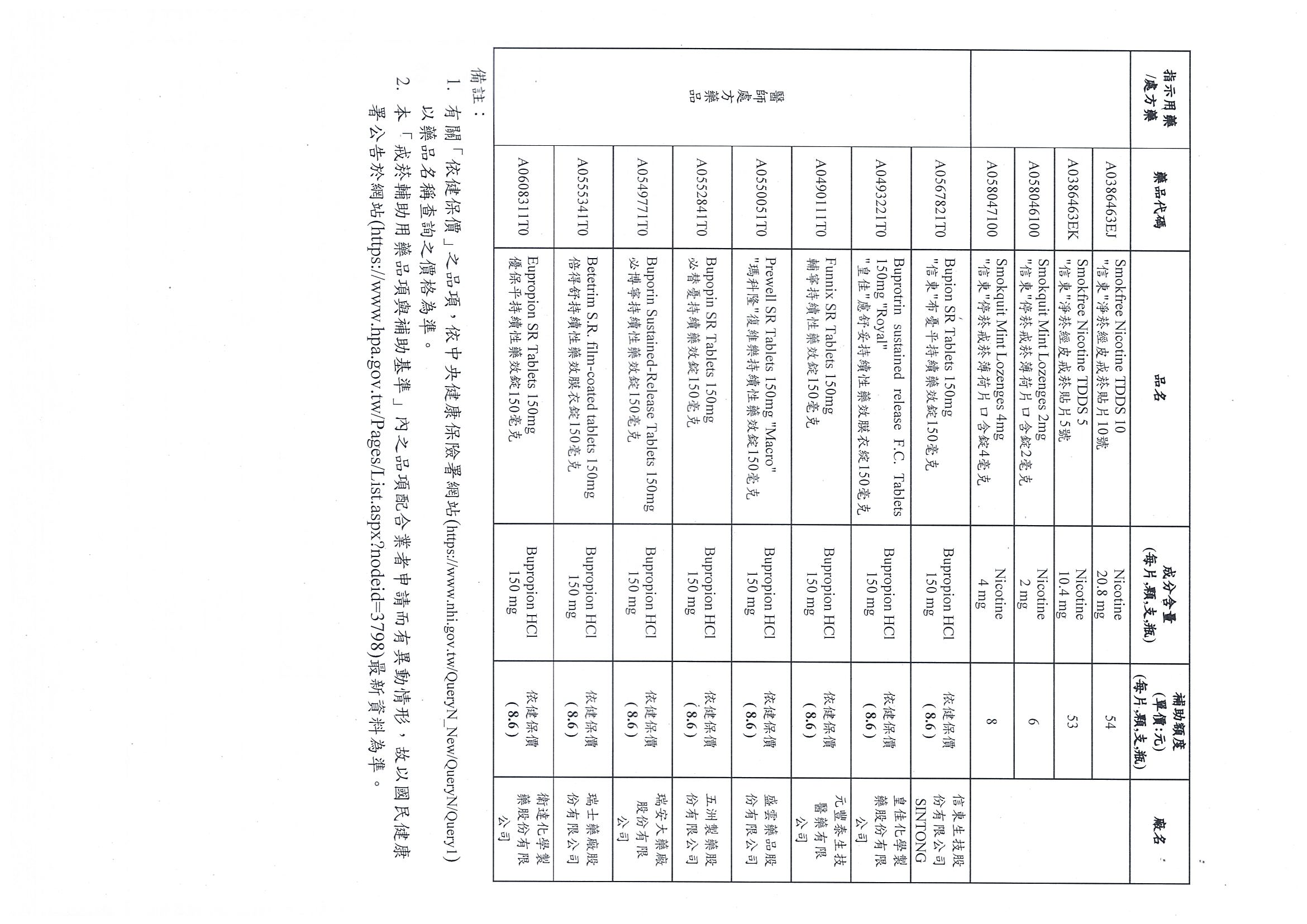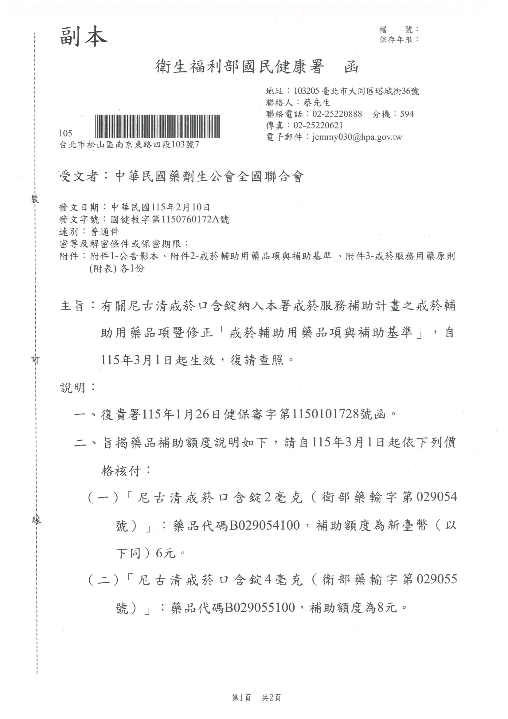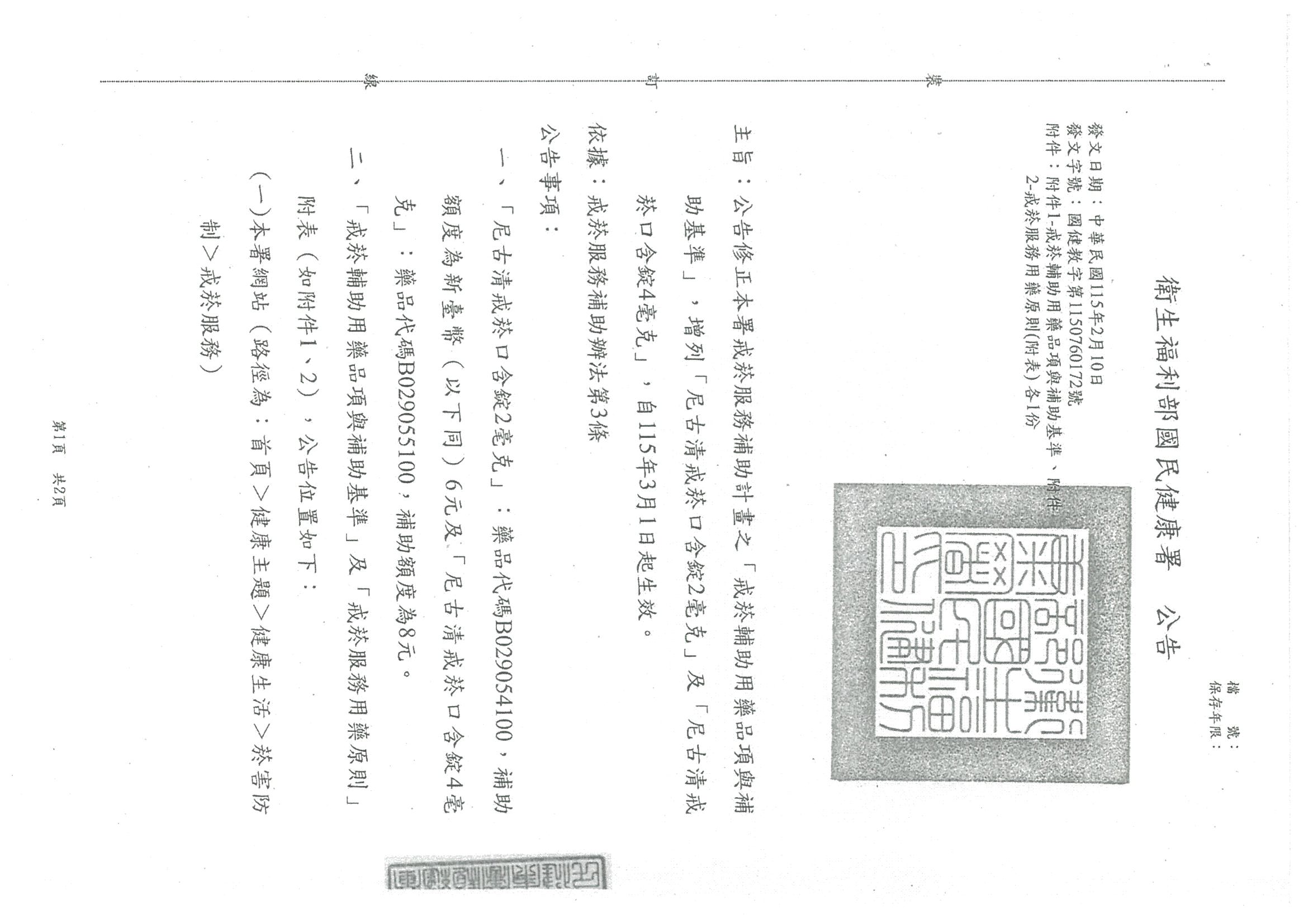 有關尼古清戒菸口含錠納入本署戒菸服務補助計畫之戒菸輔助用藥品項曁修正「戒菸輔助用藥品項與補助基準」,自115年3月1日起生效,復請查照。